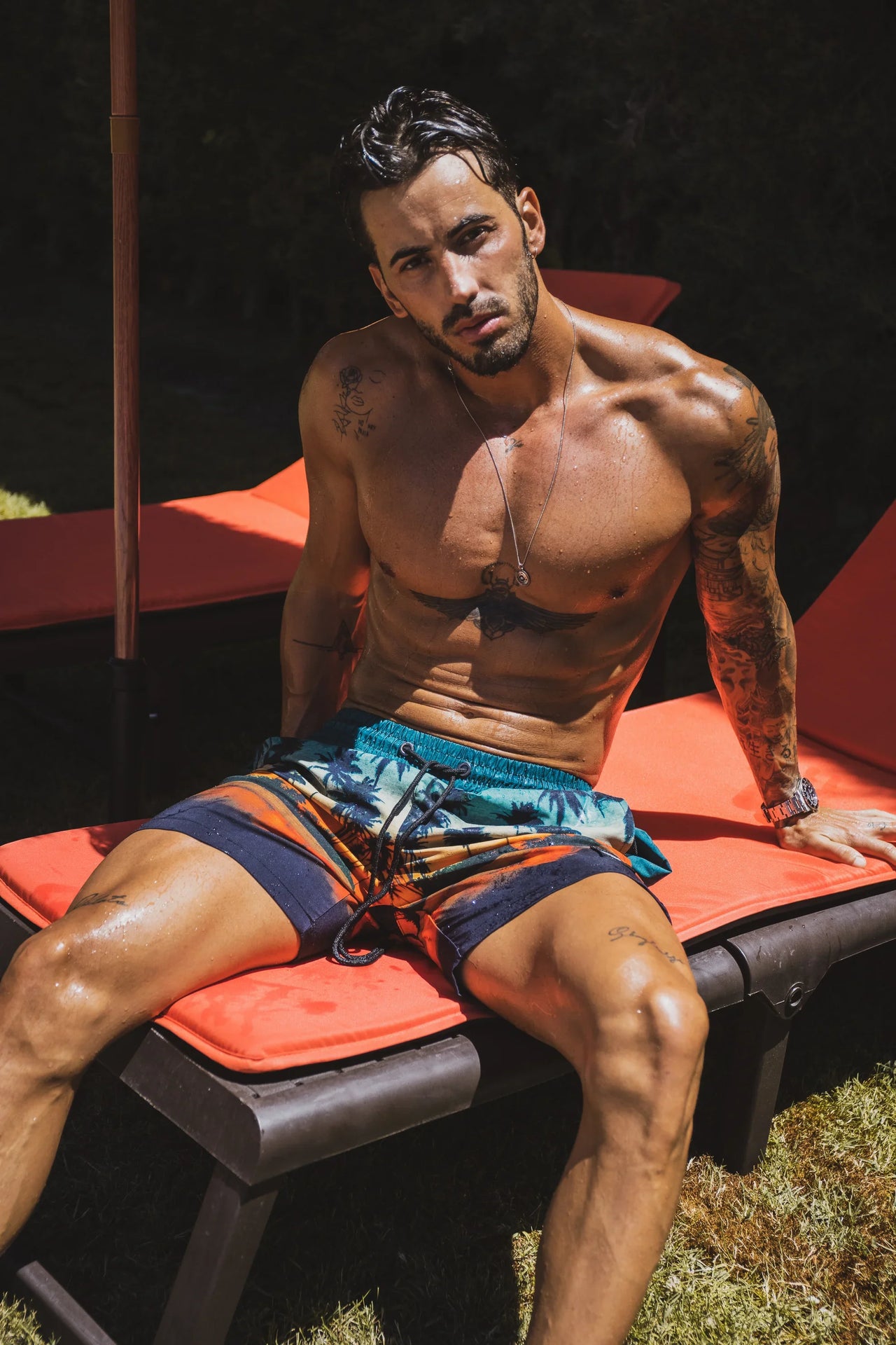 Der Badeanzug mit Allover-Print eines Sonnenuntergangs in Los Angeles, Kalifornien, gehört zu unserer Morengar® Sommerkollektion. Die kurzen Badeanzüge passen zu jedem Morengar-Artikel.
