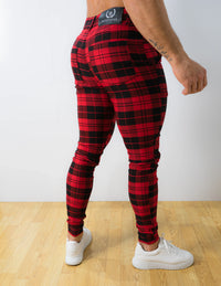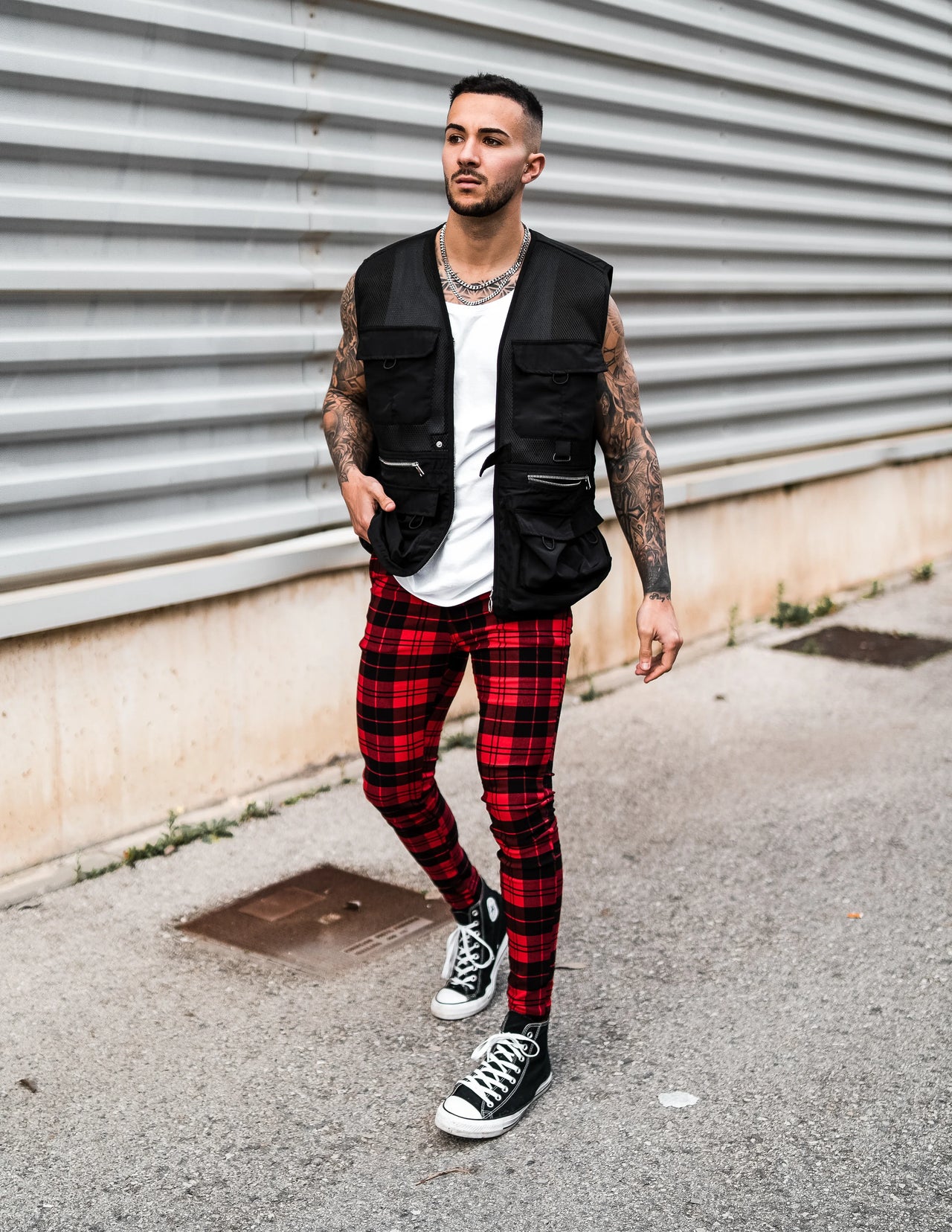 • Pantalón rojo con cuadros blancos en tonos negros (oscuros y claros). Der Stoff dieser Hose ist elastisch und sanft.