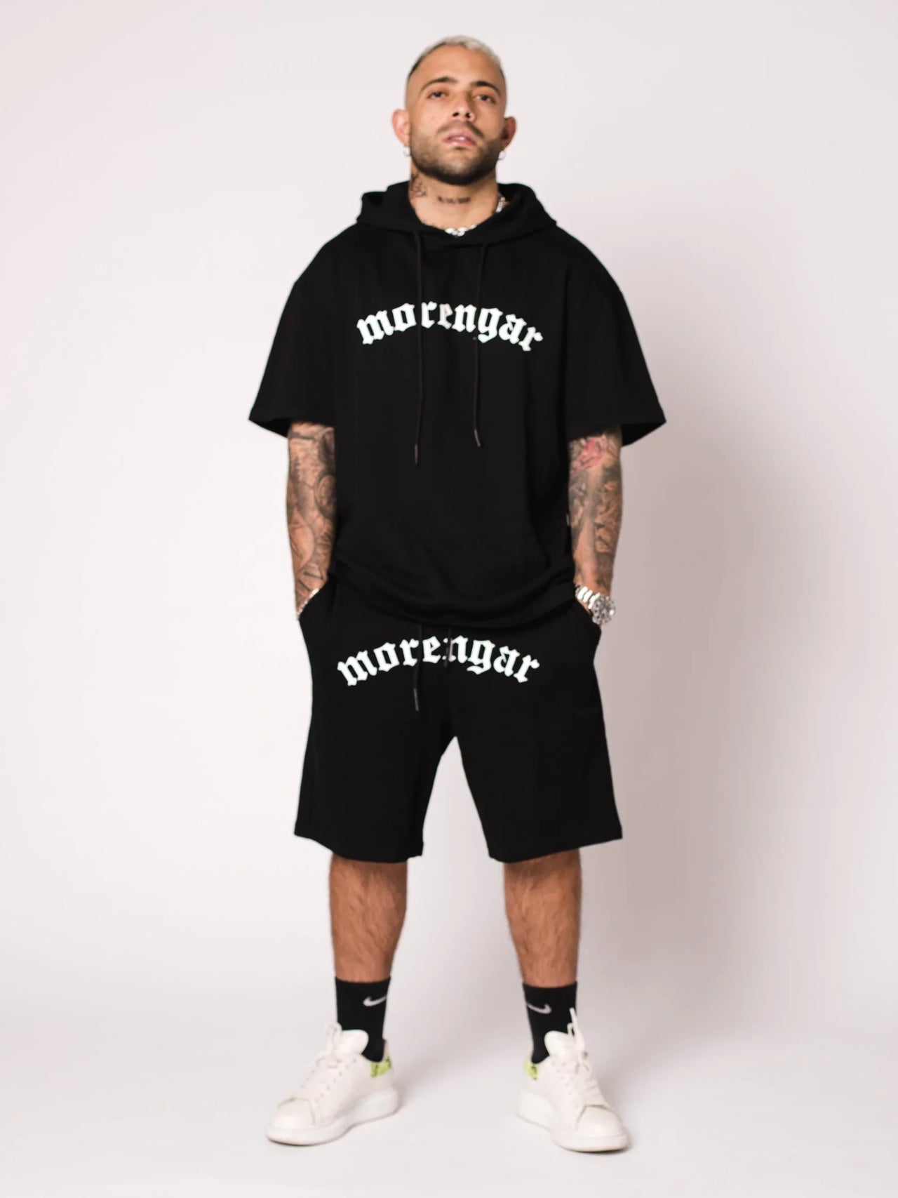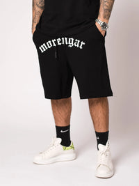 Übergroße schwarze Shorts mit dem geschwungenen „morengar“-Logo auf der Vorderseite, Siebdruck in Weiß. Short mit Fronttaschen, elastischer Taille, langen Schnürsenkeln, die der Farbe der Short entsprechen, mit Silikonverstärkung.