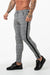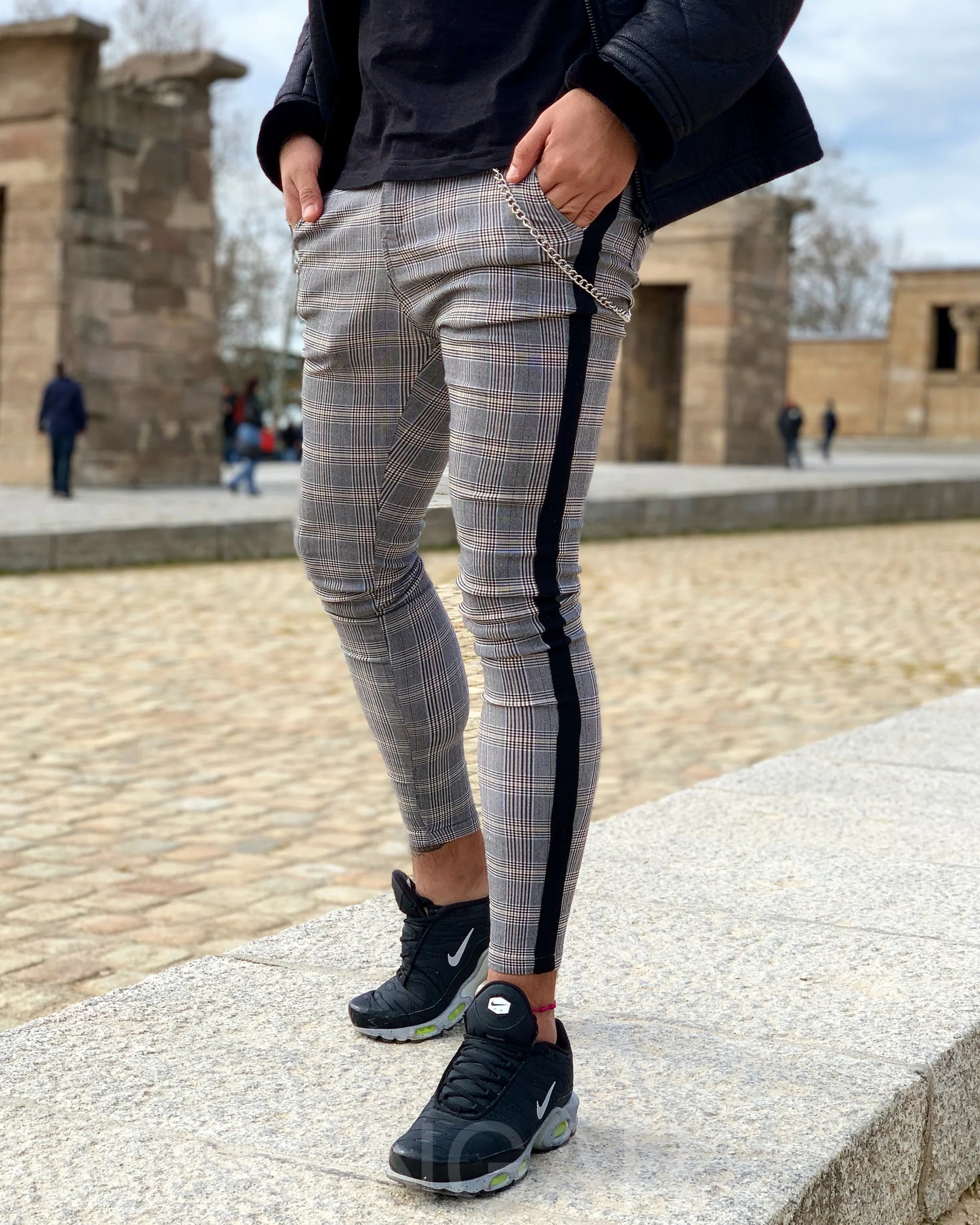 • Decoración: Pequeñas líneas horizontales y verticales que forman cuadros en todo el pantalón. Estás líneas tienen tonos grises, amarillos y negros. Como broche de oro, se añade una raya negra elegante a lo largo de ambas piernas del pantalón.