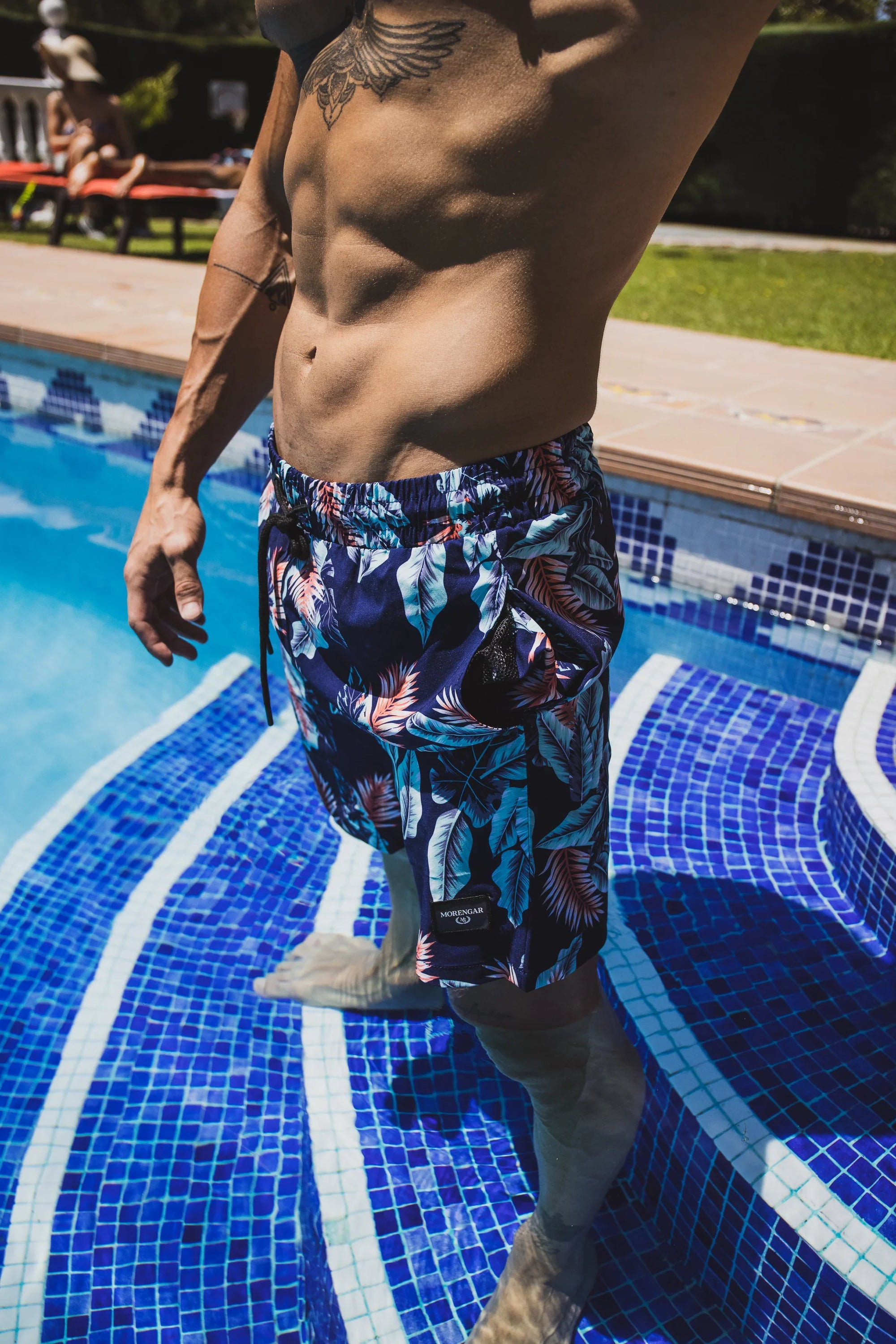 El Bañador en color azul con estampado colorido de palmeras y hojas, pertenece a nuestra colección Verano de Morengar®. Los bañadores cortos combinaran con cualquier artículo de Morengar.