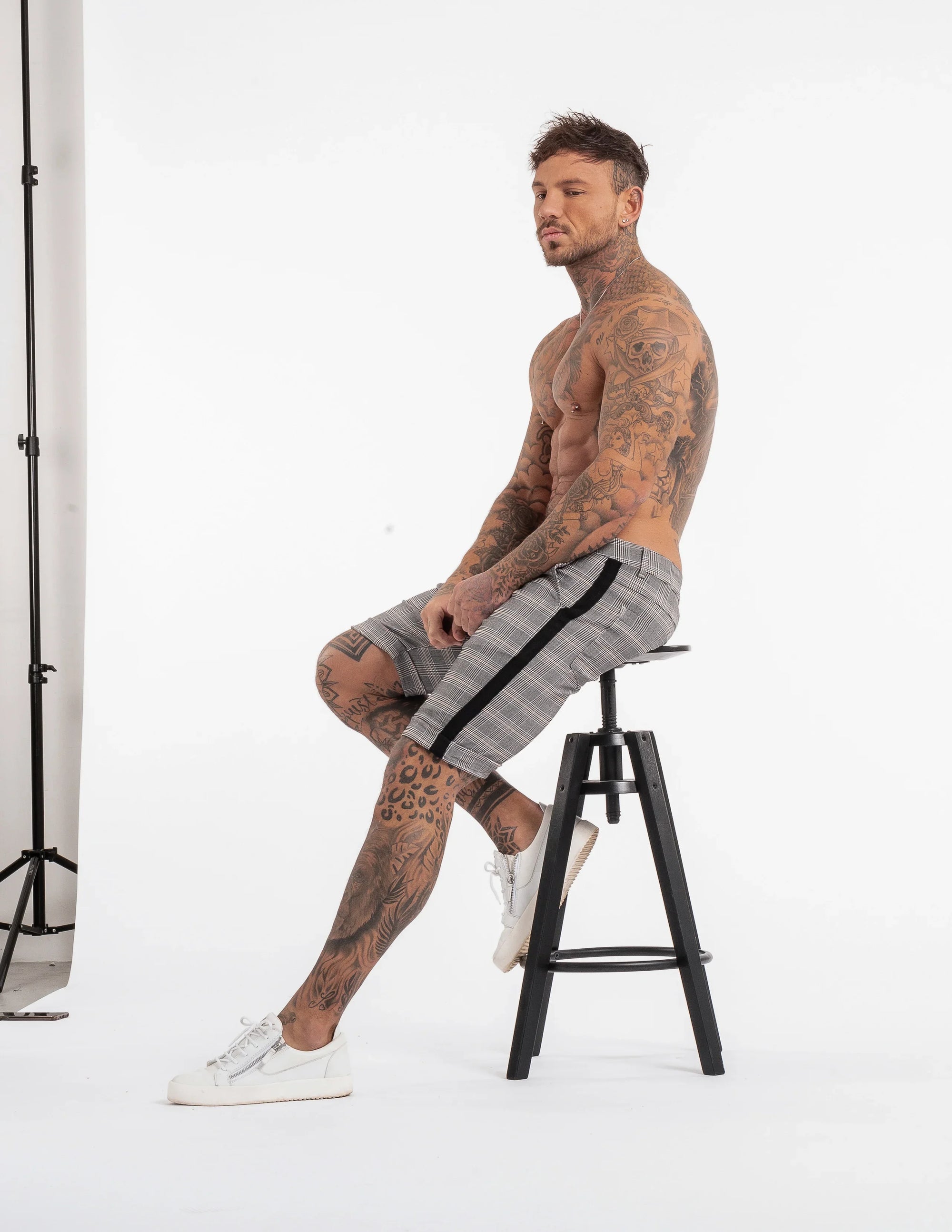 • Decoración: Pantalón gris con pequeñas líneas horizontales y verticales que forman cuadros en todo el pantalón. Estás líneas tienen tonos grises, amarrillos, negros, blancos. Como broche de oro, se añade una raya negra elegante a lo largo del lateral de ambas piernas del pantalón corto.