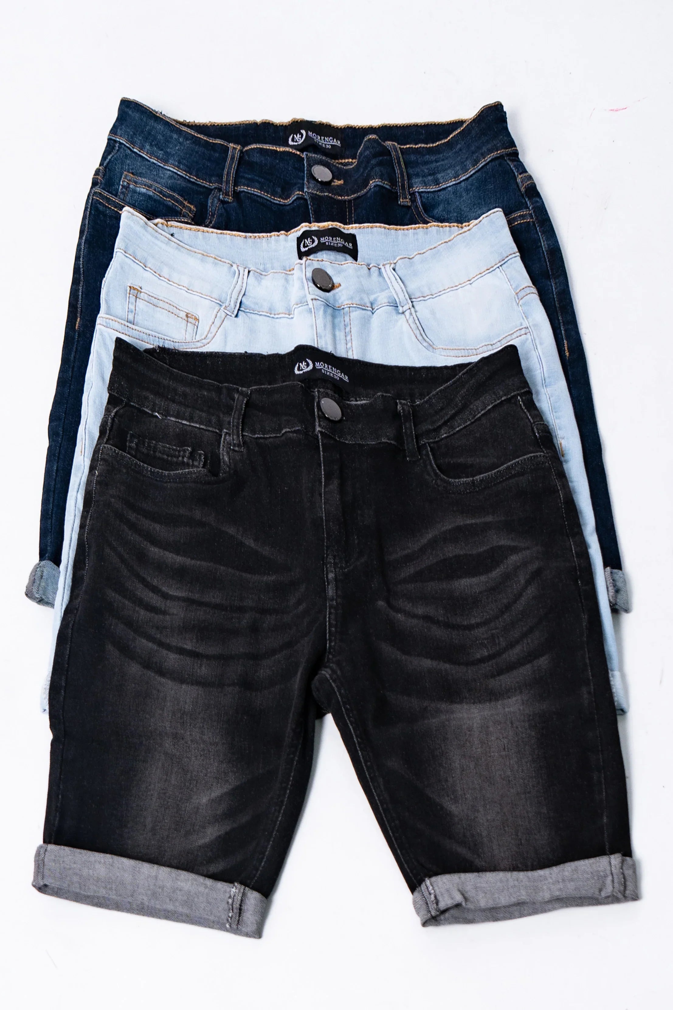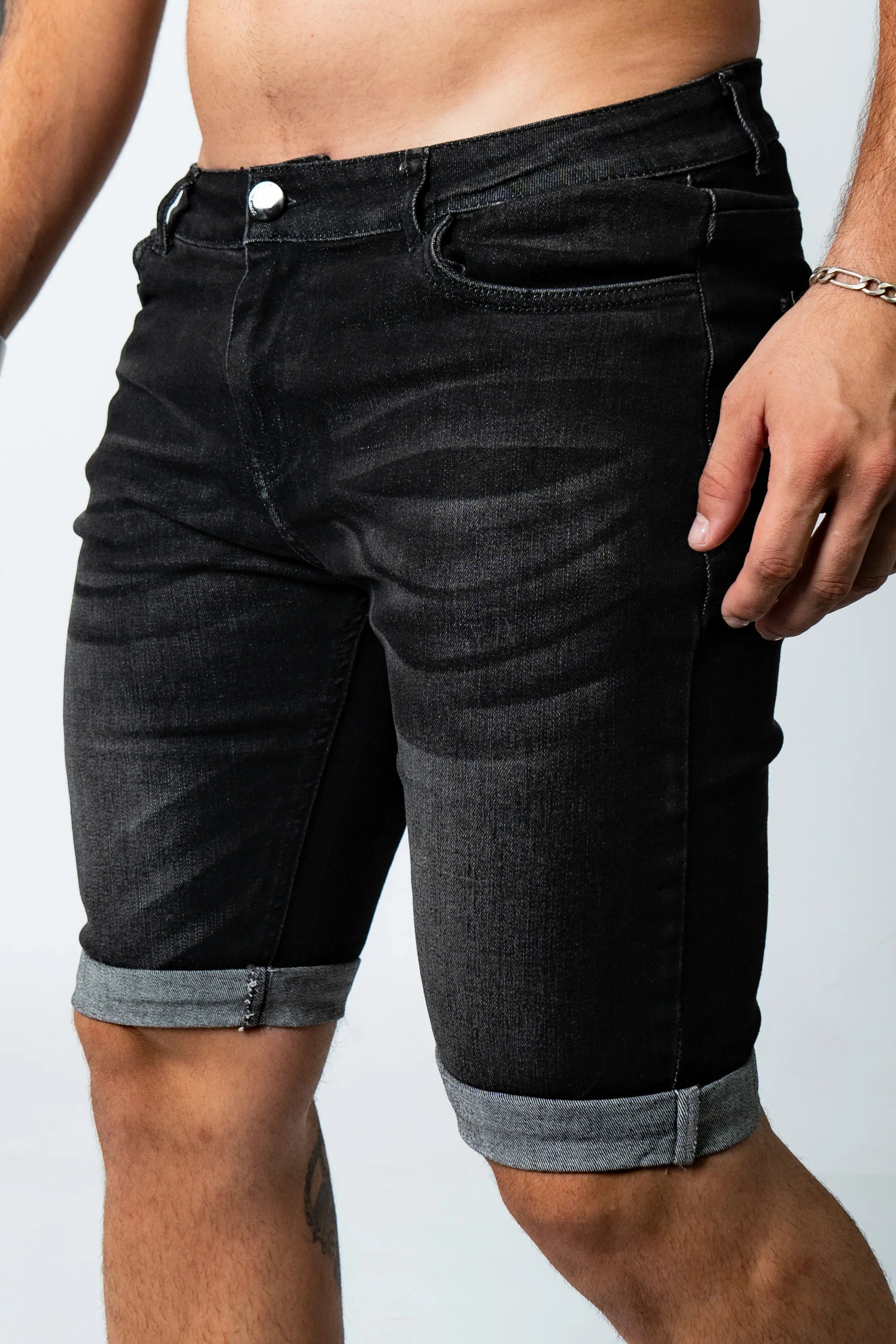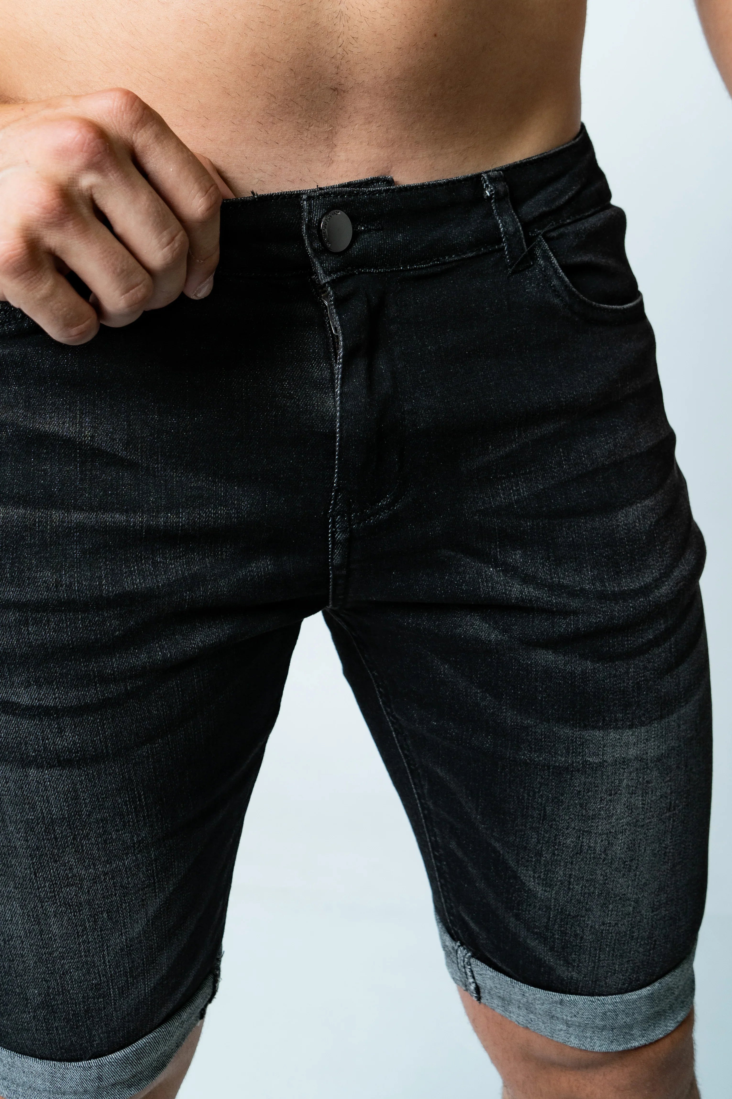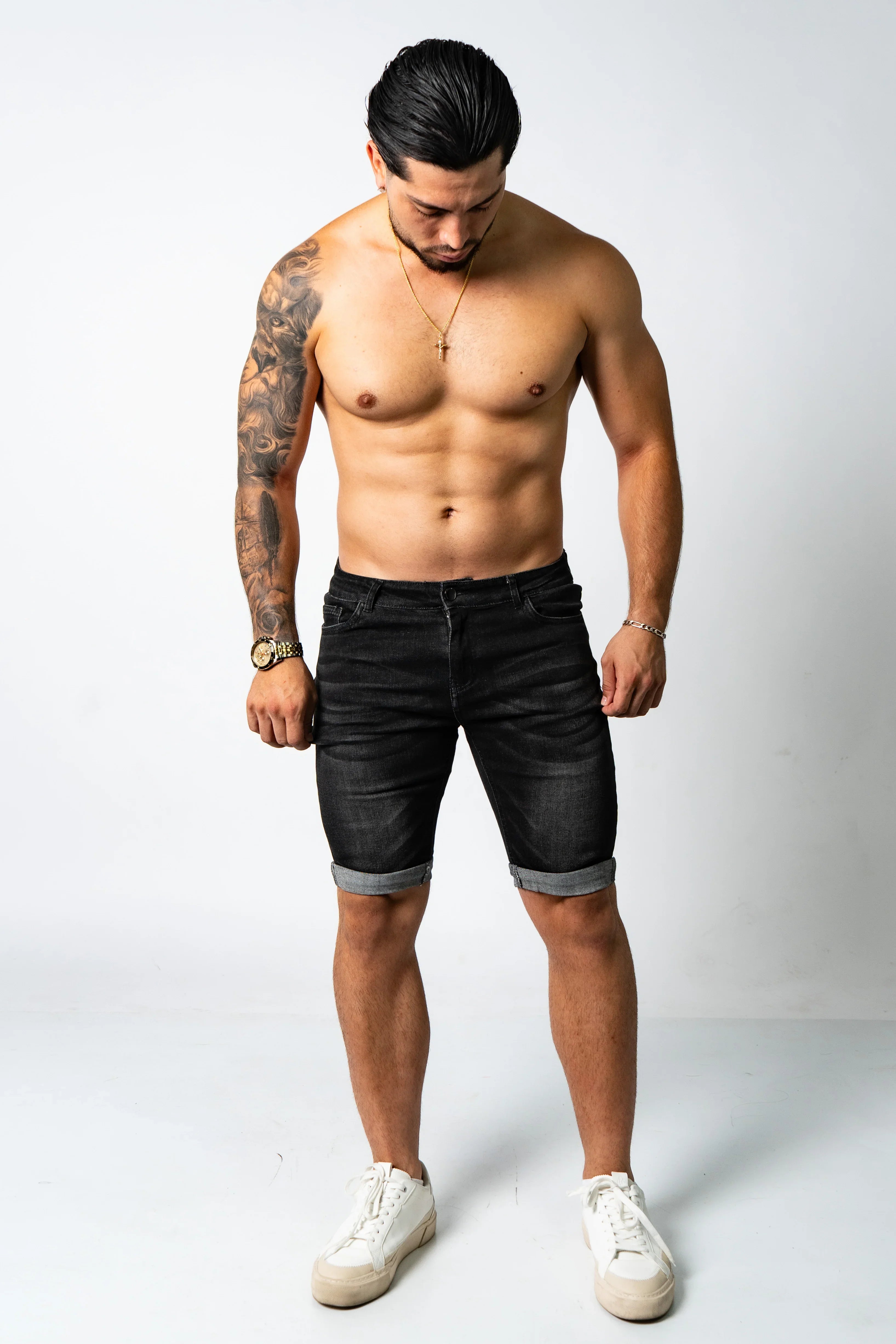 Slim fit denim shorts made from high quality stretch denim, designed with classic 5-pocket styling and a metal front zip with metal button fastening, and black faux leather back patch embossed with the brand name.